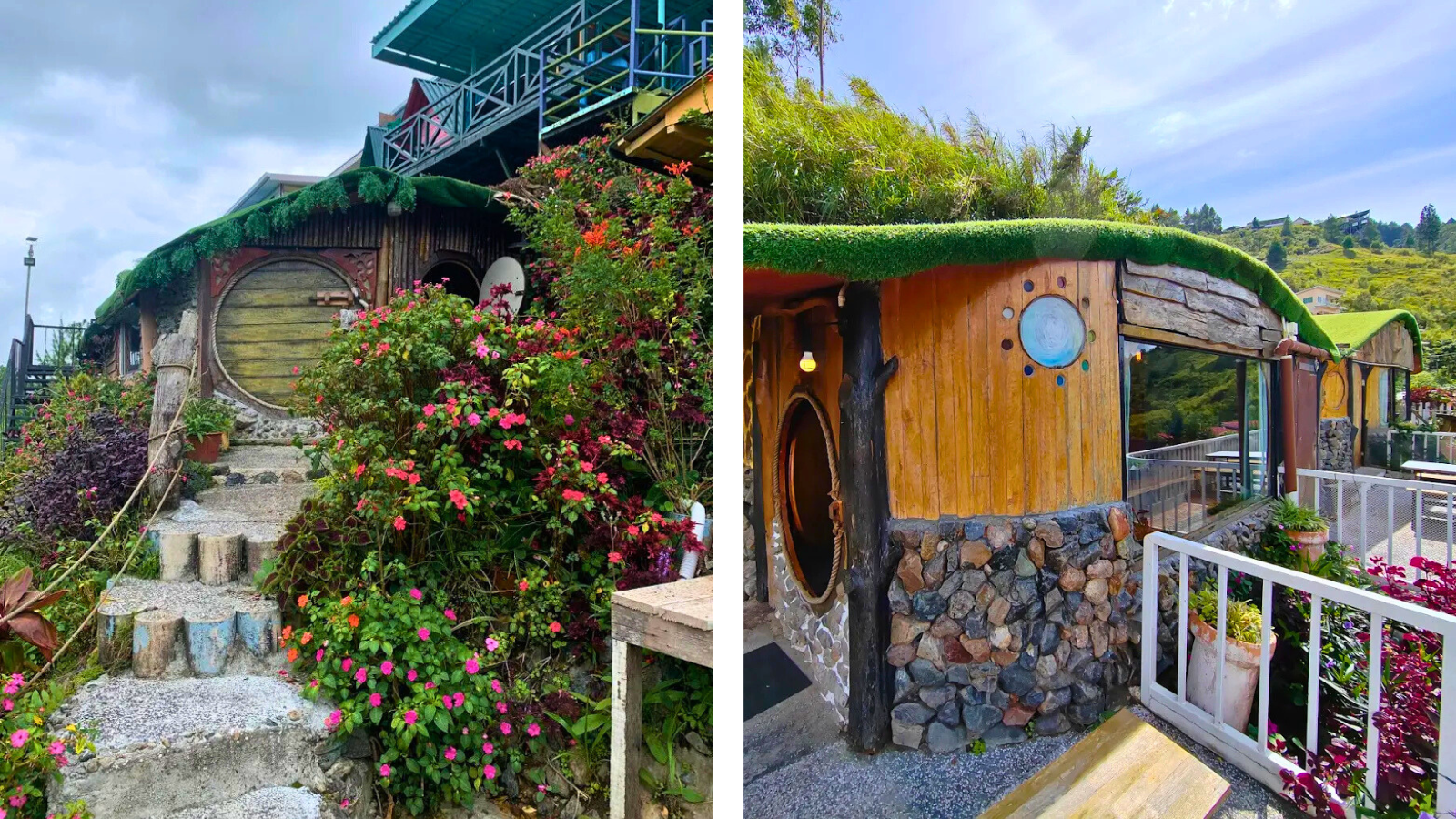 The most iconic feature of Humble Hobbit Home Kundasang is its architecture. Each unit is designed to resemble a hobbit dwelling, complete with rounded doors, stone facades, and grass-covered roofs. The structures are built low to the ground, creating the illusion that they are emerging naturally from the hillside.