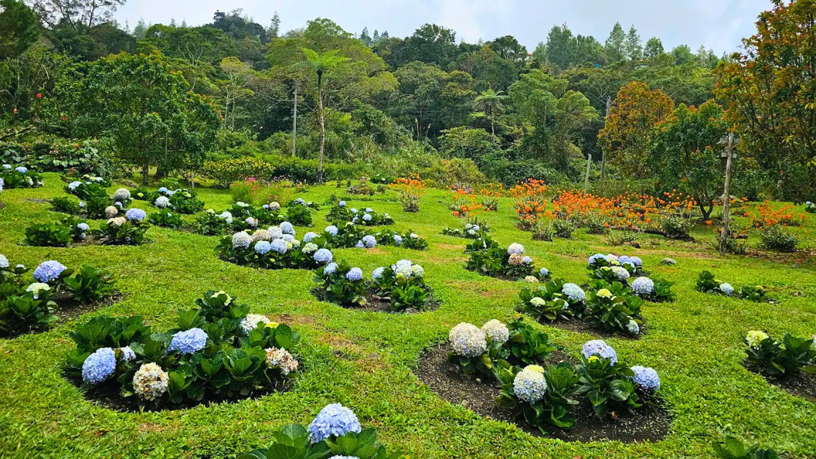 The garden features meticulously arranged floral displays including hydrangeas, daisies, lilies, and petunias, creating a colourful contrast against the misty mountain backdrop. Unlike urban parks, this attraction offers a more natural layout with walking trails, rustic bridges, and streams that weave through the property.